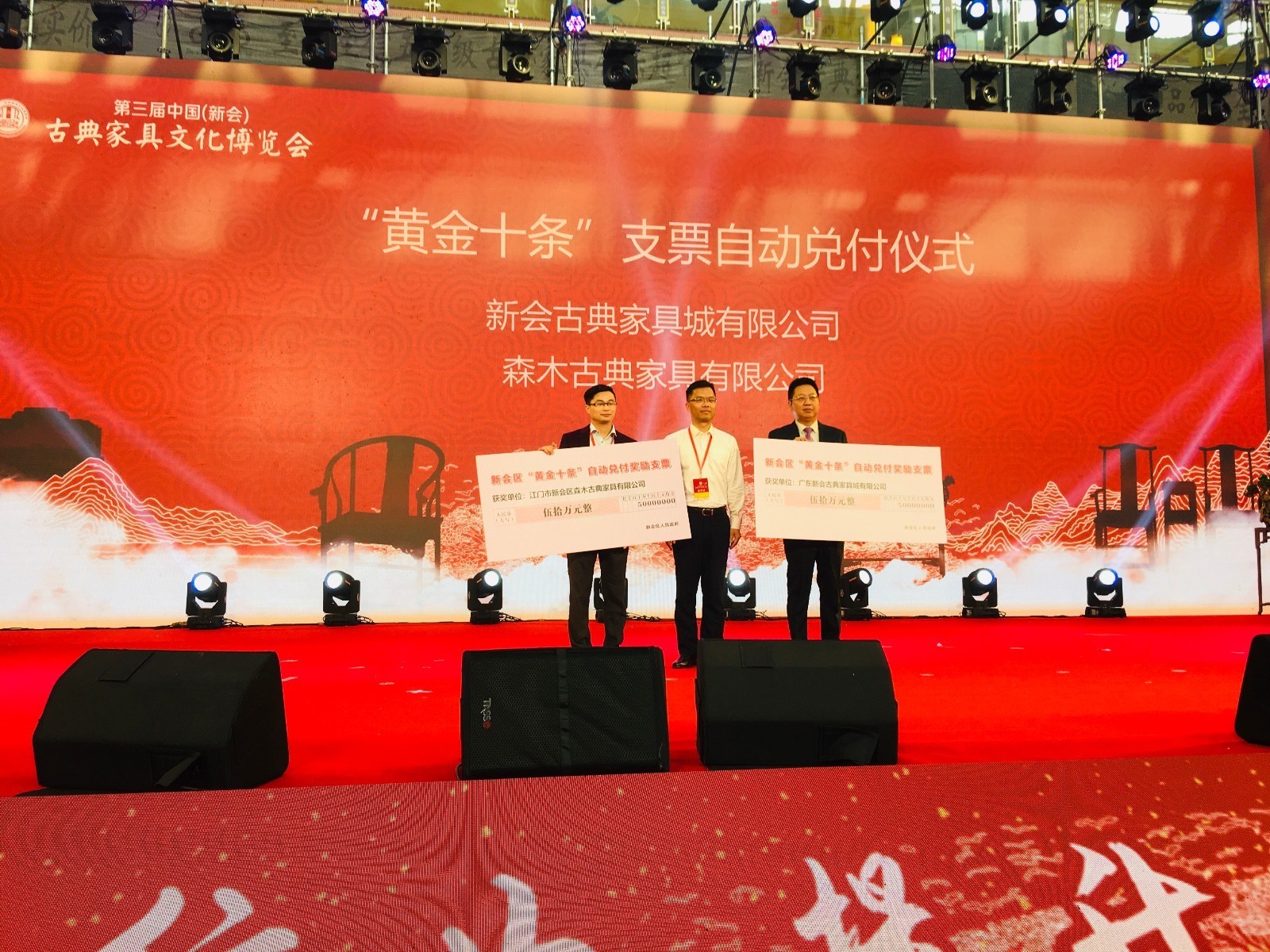 仪式现场,新会区委副书记、区长梁明建重点介绍了新会古典家具产业发展成果及古典家具文化博览会的开展情况,并对古典家具行业小升规企业授予了“黄金十条”兑付支票。中国工艺美术协会周郑生会长、中国家具协会屠琪副理事长及中国家具协会传统家具专业委员会主席团常务主席、中国工艺美术协会副会长伍炳亮分别致辞,重点介绍了新会传统家具行业在新环境、新形势、新发展背景下,如何对产业链进行产业创新和突破,为全国古典家具行业的提升和发展,贡献更多“新会经验”。近年来,新会营商环境不断优化。自2017年以来,江门市新会区出台了促进经济发展“黄金十条”,用以扶持相关产业和鼓励企业发展,每年最高安排奖励资金2亿元,充分调动了企业的积极性,增强了企业投资发展的信心,为新会区经济发展注入新鲜活力。2018年,新会继续深化“放管服”改革,创新实施对企奖励自动兑付,设立全市首个政策兑现窗口,全年兑付“黄金十条”奖金5700多万,落实涉企税费各项减免政策,全年为企减负超20亿元。